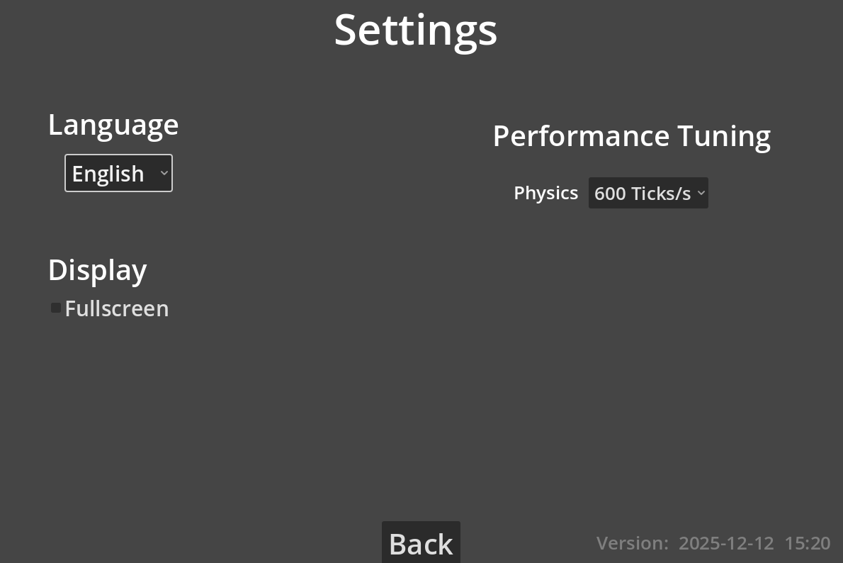 - Added an option for the number of physics ticks per second - the default is 600 ticks/s and should be used if possible as is guarantees required precision. But for older machines, this setting might be too high and slow down the whole game. In that case you can set it down and still play (with more inaccurate collisions).